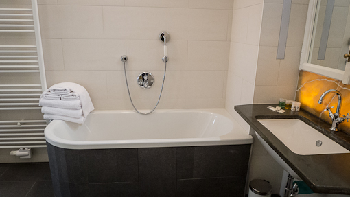 Modern bathroom. They supplied us with threes of everything from towel to toiletries, and even 3 Nespresso pods in the kitchen.