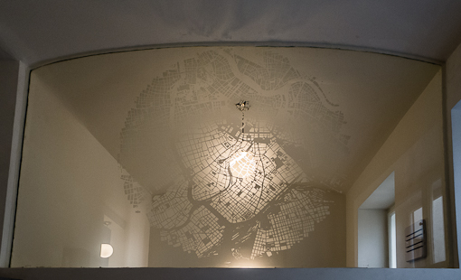 This piece of glass separates the kitchen and the bathroom and I believe it is a map of Vienna.