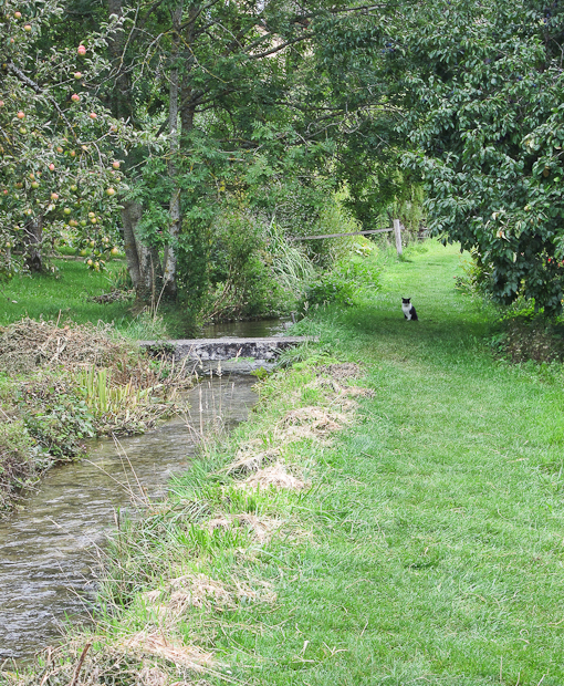One Autumn day last year, we and J and J went for a short hike on the Sentier du patrimoine de Romainmôtier. On our way back to our car, near Croy, we walked along a beautiful idyllic garden path. It runs behind a row of houses along a stream, separating the back of each house from a patch of land on which the owners planted flowers and vegetables.