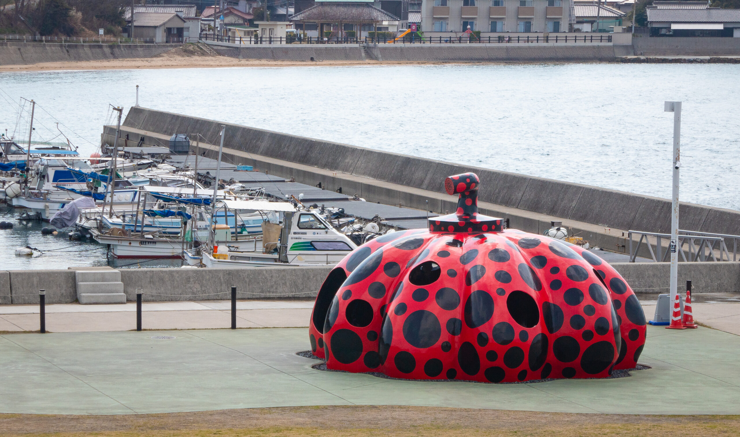 The first piece of art visible from the ferry is the Akakabocha – a hollow half red pumpkin (赤かぼちゃ, 2006) by Yayoi Kusama 草間 彌生, installed on grass on one of the piers of Miyanoura 宮浦 port. Some of the black spots are actually holes and one can climb inside this sculpture.