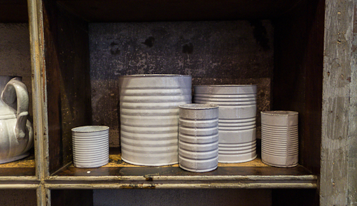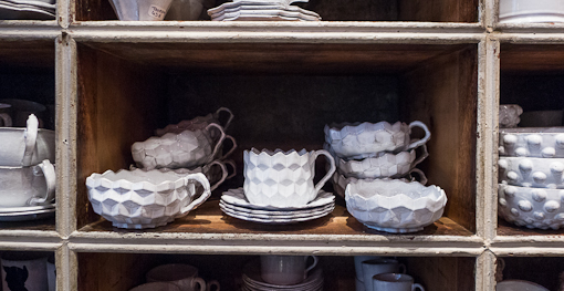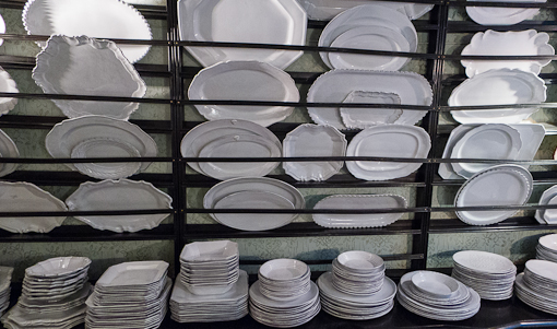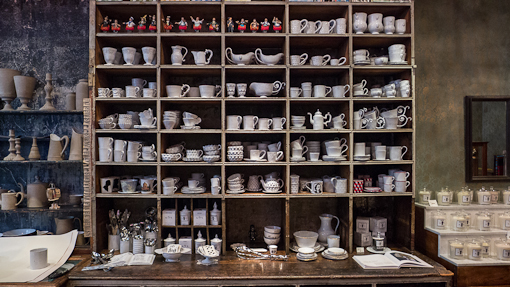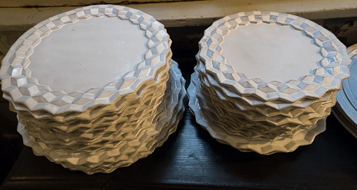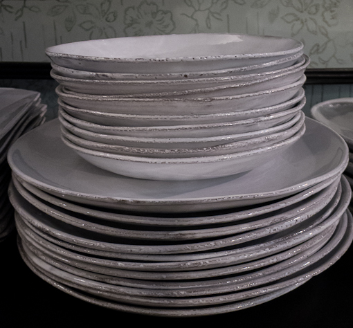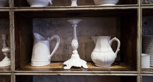 The tableware collection is inspired by 18th and 19th century designs and is glazed to create a milky white finish – a bit like a pile of unfinished paint job.