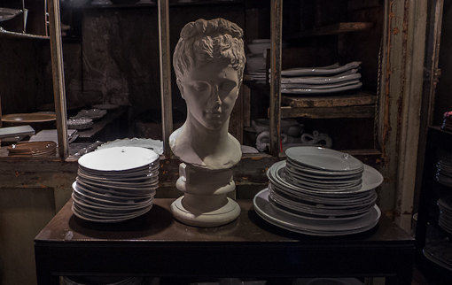 The “de Chirico” ambiance of the back room matches the merchandises.