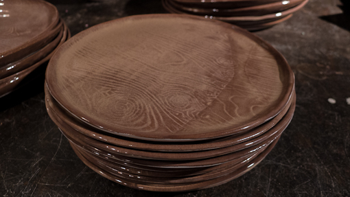 These ceramic plates with wood grain could have been taken from a painting by Magritte.
