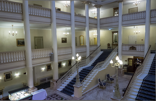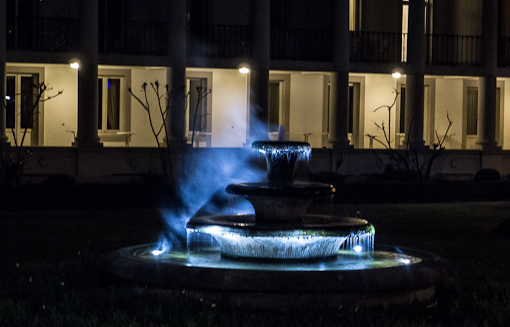The fountain of the hotel is fed by warm spa water as evidenced by the mist.