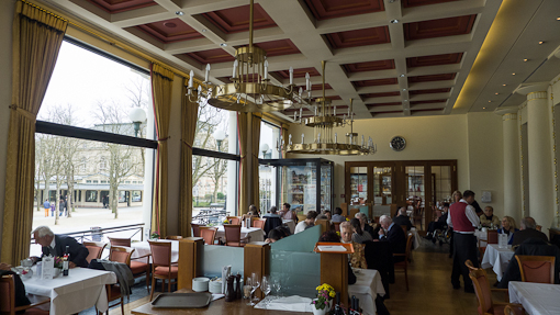B-Baden-18People were very well dressed even in the coffee shop which looks out onto an open plaza (Kurgarten) with small shops, a lawn and a bandstand.