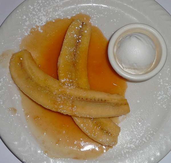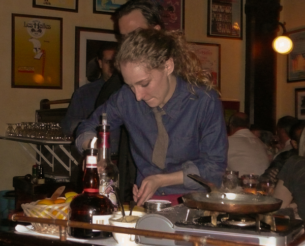 Sue organized a surprise birthday dinner with friends for me at Les Halles at Park Avenue last night. The evening concluded with desserts, one of which was the banana flambe prepared tableside. Our waitress wheeled over a little serving trolley with stove, and parked it next to Betty. Sprinkled with powered sugar, the bananas were drenched in Goslings rum and Grand Marnier, and lit. For those of you who have not met Betty, she has lovely long hair. You gotta love July’s expression of concern for Betty’s safety. Sitting at a safe distance away, Evan was our cameraman. Sue said it was the sweetest bananas she ever had. Thank you guys for dinner and the fun evening.