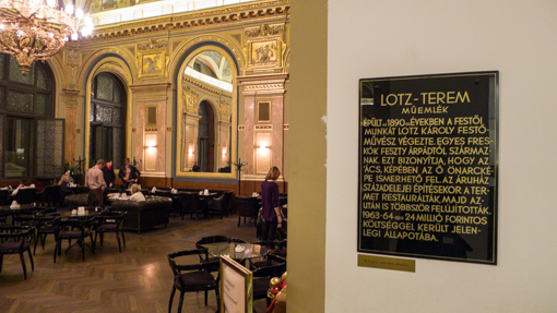 The Lotz Hall (Lotz-Terem) was named after Karl Lotz who painted the murals inside the Alexandra Bookcafe, as well as those of the Budapest Opera, Hungarian Parliament, Hungarian National Museum, St. Stephens Basilica, the ceiling fresco in the Buda Castle and many many more.