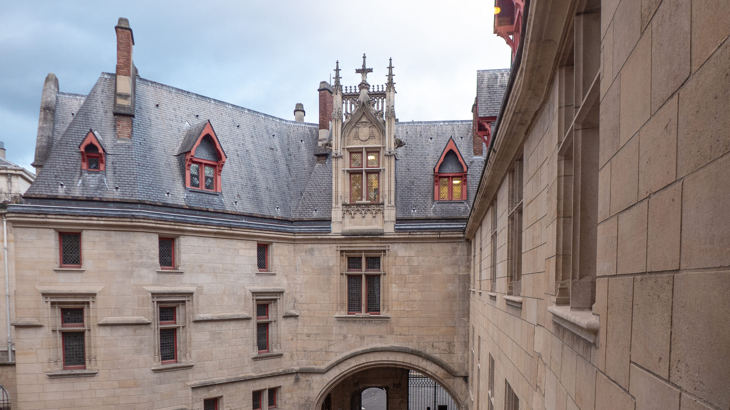 The architecture of the Hôtel de Sens includes Gothic turrets, machicolations, and Renaissance-style dormer windows. The Hôtel de Sens boasts a picturesque garden, and a courtyard which serves now as a drop-off zone for the library. The building is adorned with historical details such as stone carvings, a large spiral staircase, and a grand fireplace.