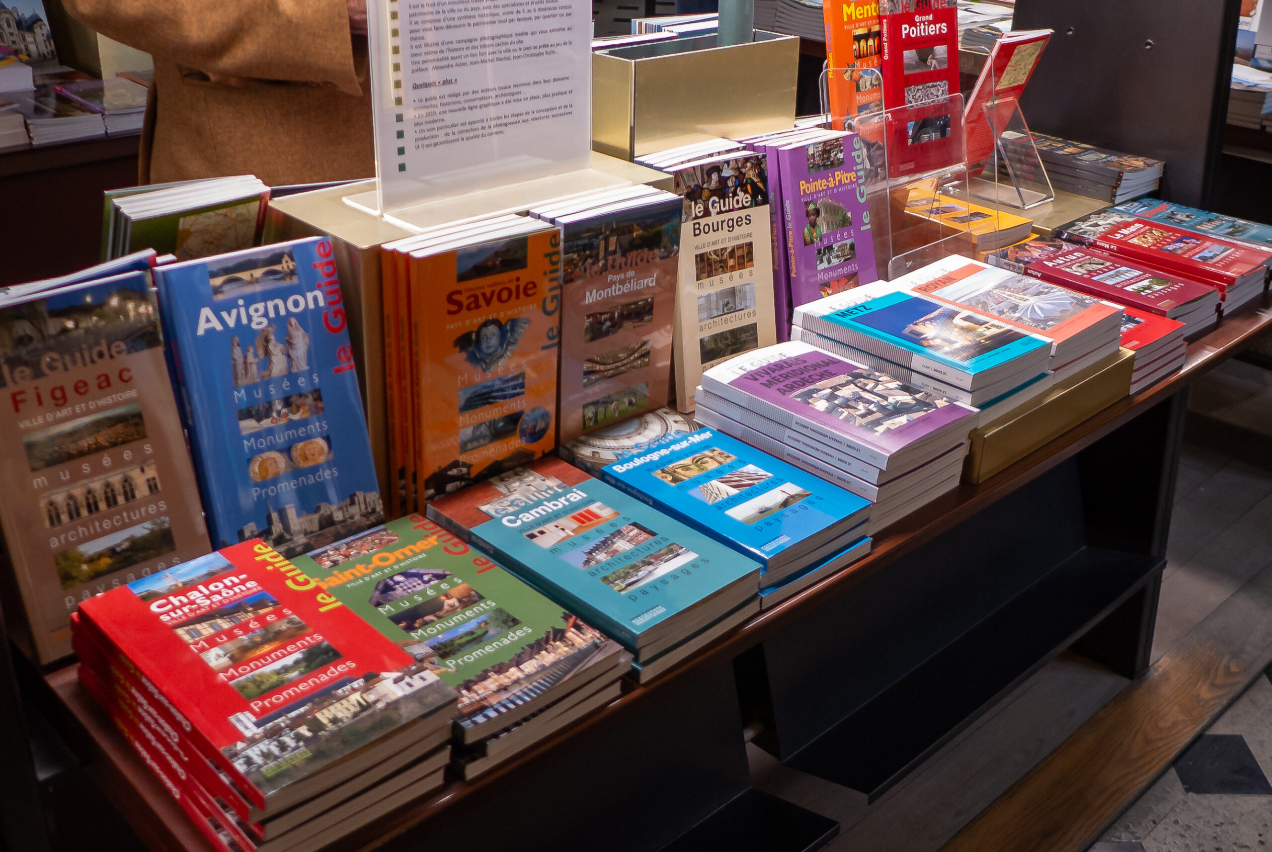 The bookstore offers an exceptional collection of works, including the full catalog of Éditions du Patrimoine published by the Center for National Monuments (Centre des Monument Nationaux). We will give you a tour of the tables of books.