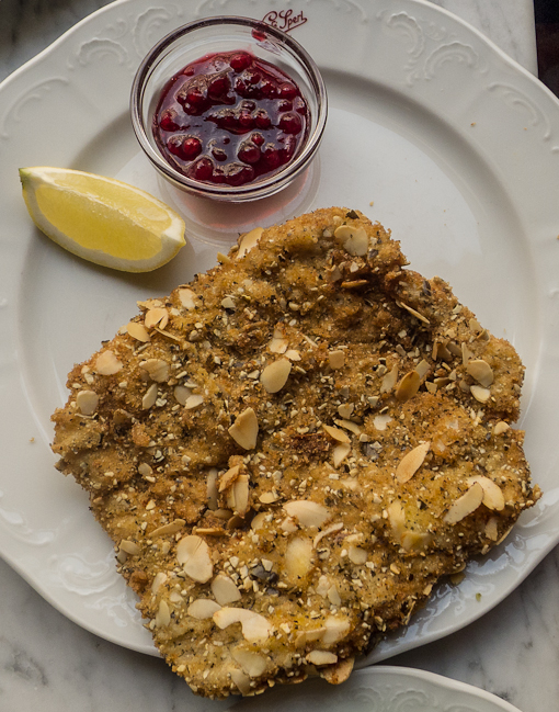 One of us had a special wiener schnitzel that is covered not just with bread crumbs but also with nuts and corn.