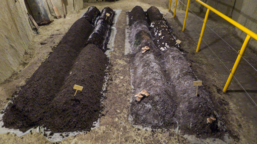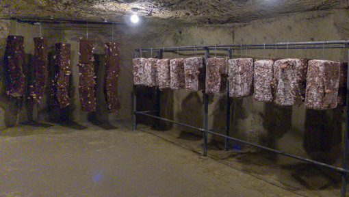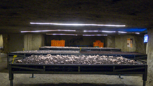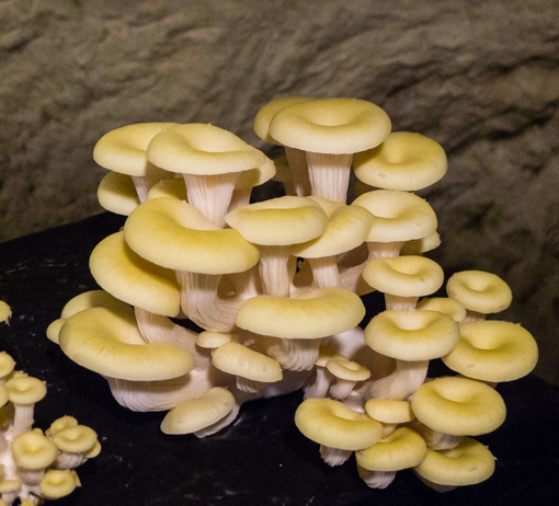 The caves provide an environment of high humidity and constant temperature that is perfect for growing mushroom. Many of the caves were once part of a quarry. This facility at the museum produces four types of mushrooms commercially: white or brown button mushrooms, shiitakes, oyster mushrooms including the yellow pleurotes and blue foot mushrooms aka blewits (something new for us).