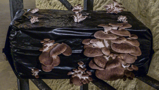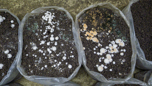 Pleurotus ostreatus or 蠔菇, the oyster mushroom, are mainly cultivated in large polyethylene bags stuffed with hay, sawdust, wood chips, etc in layers, and spawn sown between these layers.