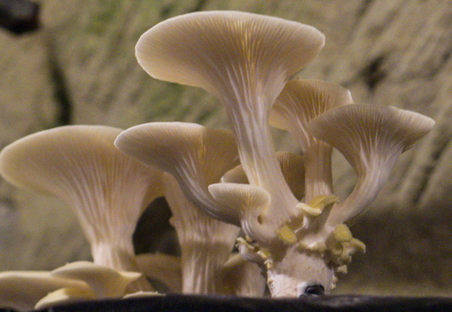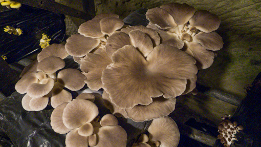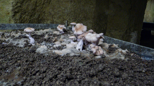 The last type of mushroom cultivated here is Clitocybe nuda (also recognized as Lepista nuda and Tricholoma nudum, commonly known as the wood blewit or blue stalk mushroom). We know nothing about it. According to Wikipedia, it is an edible mushroom, found in both coniferous and deciduous woodlands. It is a fairly distinctive mushroom that is widely eaten, though there is some caution about edibility. Nevertheless it has been cultivated in Britain, the Netherlands and France. … Blewits can be eaten as a cream sauce or sautéed in butter, but it is important not to eat them raw, which could lead to indigestion. They can also be cooked like tripe or as omelette filling, and wood blewits also make good stewing mushrooms. They have a strong flavour, so they combine well with leeks or onions. They were not in season or something … as this is all I could find in the tunnels.