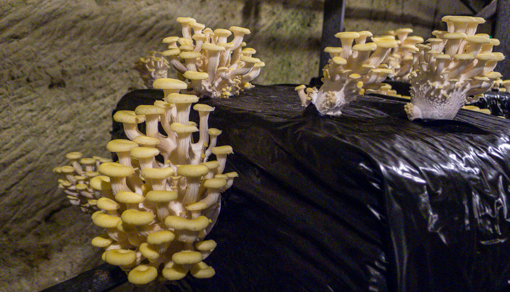 Pleurotus citrinopileatus, the golden oyster mushroom (tamogitake in Japanese) is the other type of pleurotes that are grown in this facility.
