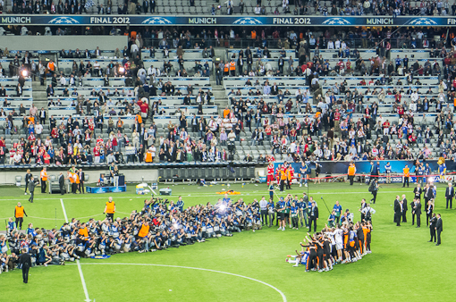 The Munich players were paralyzed on the ground with the pain of losing while the workers brought out the podium for the winners. Notice the line of policeman facing the Chelesa fans preventing from rushing into the field.
