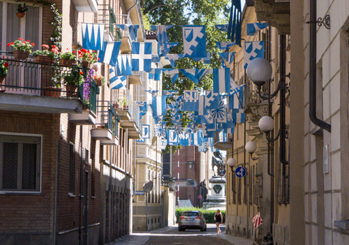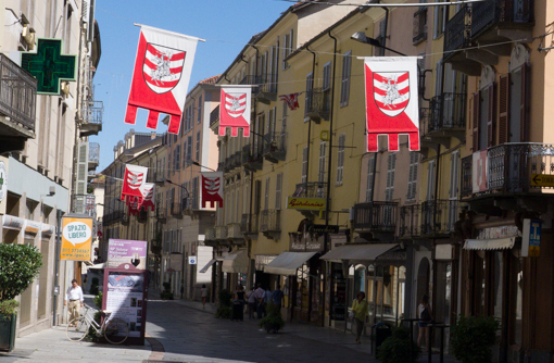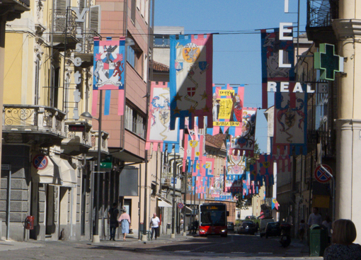 There are 14 old town wards in Asti. The coats of arms of several old town wards were prominently displayed, the race being only a couple of weeks from our visit. Based on the colors, the white and blue design is for Borgo Viatosto.