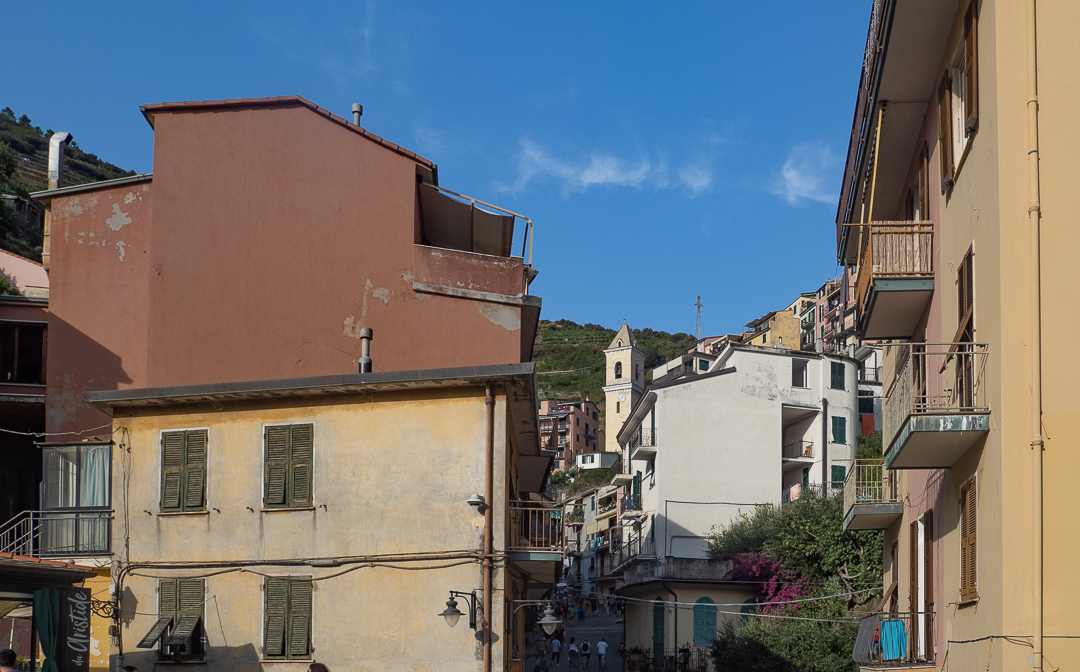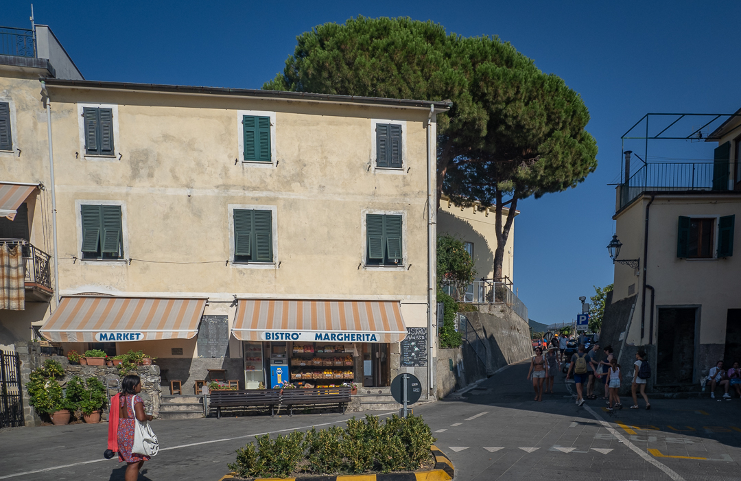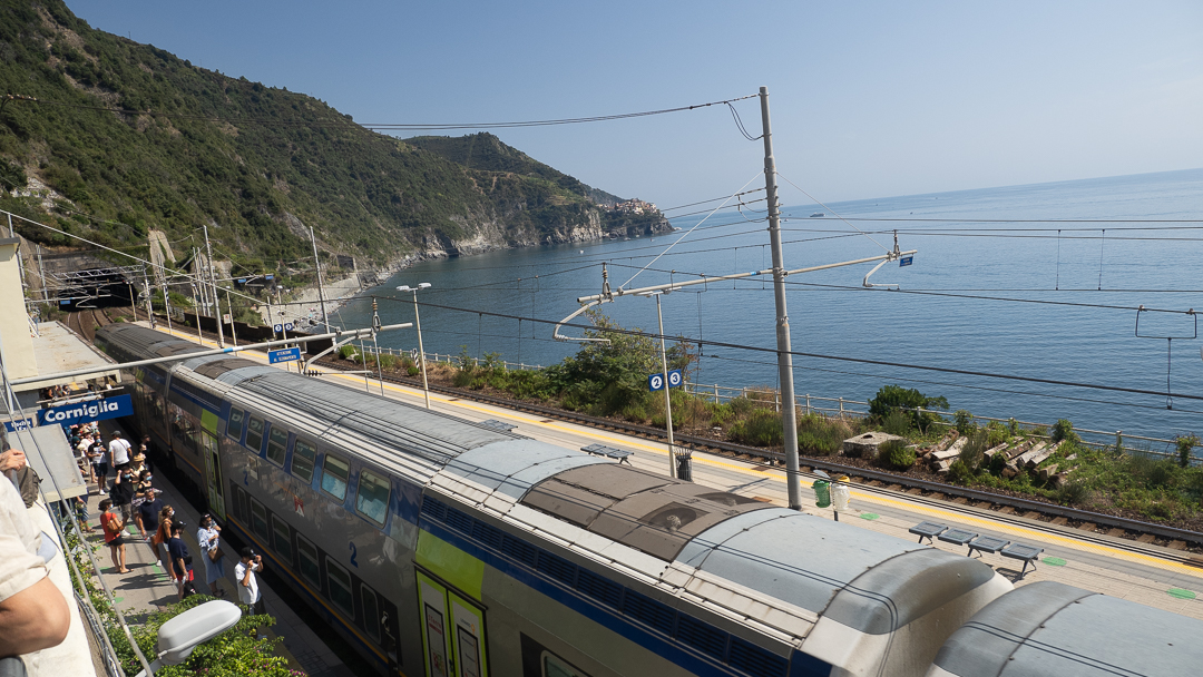 Our train from La Spezia runs just above the sea level with numerous tunnels, first stopping at Riomaggiore, Manarola, and then Corniglia. To reach the village from the station, one could climb a steep, long flight of stairs (380+ steps). Instead, like almost every one who got off the train, we waited under the sun for a minibus which was packed dangerously to what appeared to be ~150% of its capacity. We did not remember ever feeling so squeezed and hot in public transport since we arrived in Europe (10 years ago).