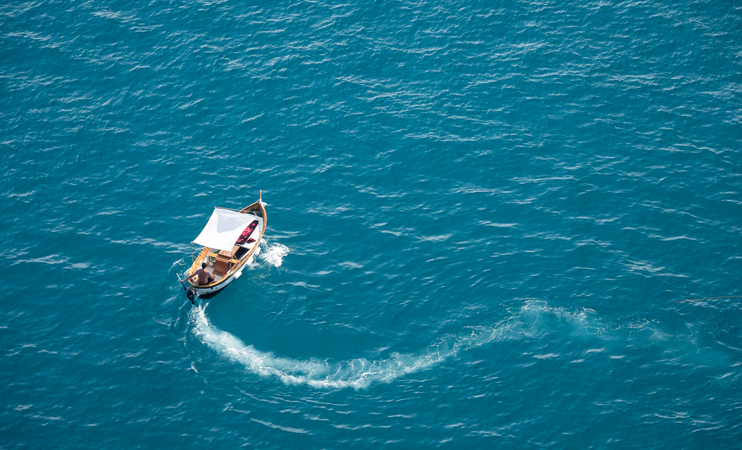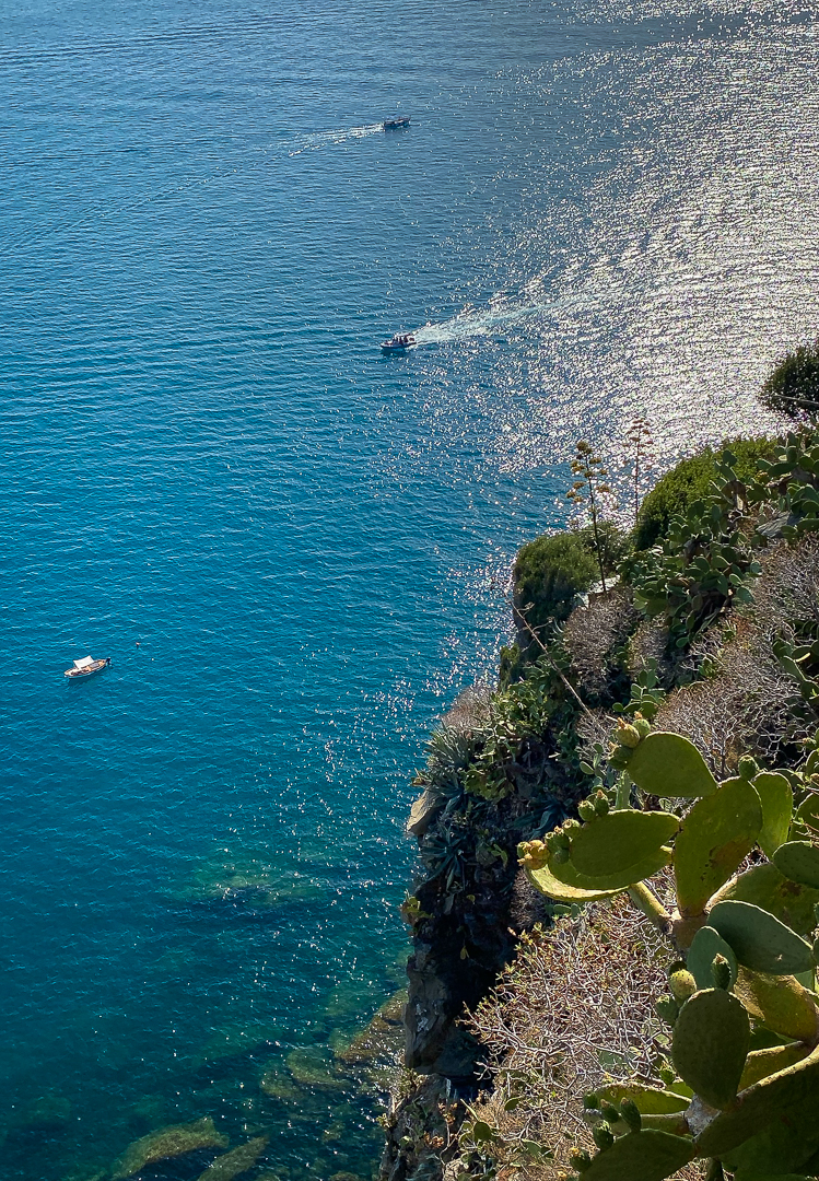 We saw Corniglia again the next day on board a boat. The belvedere, marked by the big white sun umbrellas, may just be visible in the photo.