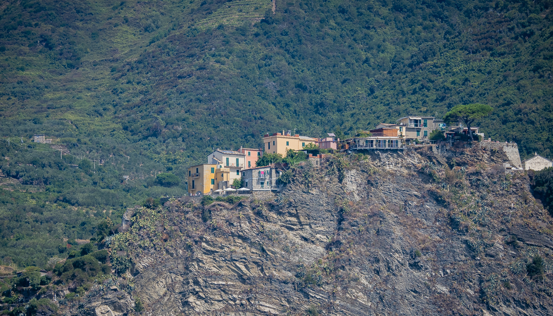 Manarola is visible to the east draping over rocks – photos at different zoom levels. Click to see a larger-size photo.
