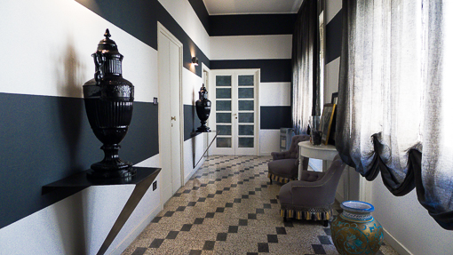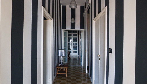 Notice the horizontal stripes, there are also vertical stripes in the apartment too. The style of the decoration is bold to say the least. A bit of the psychedelic 1970’s vibe.