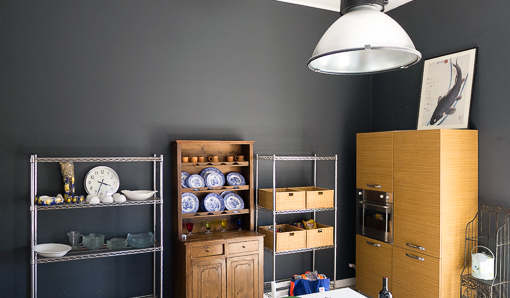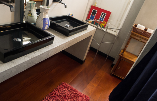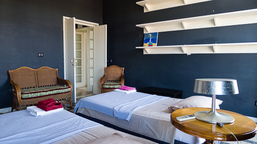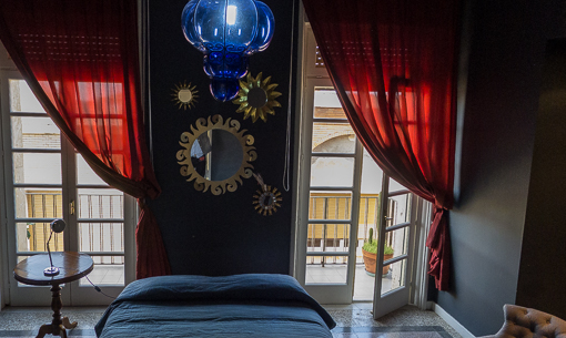 The rather dramatic crimson red and inky blue master bedroom completes the Dario Argento-like set up.