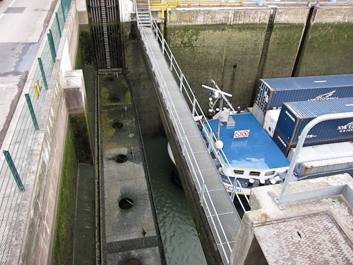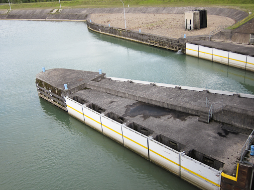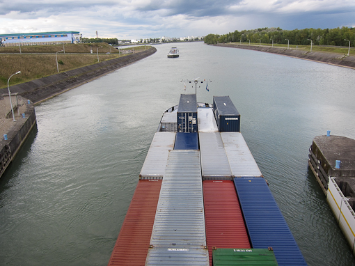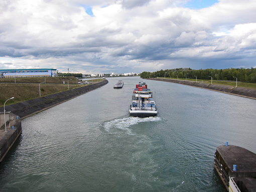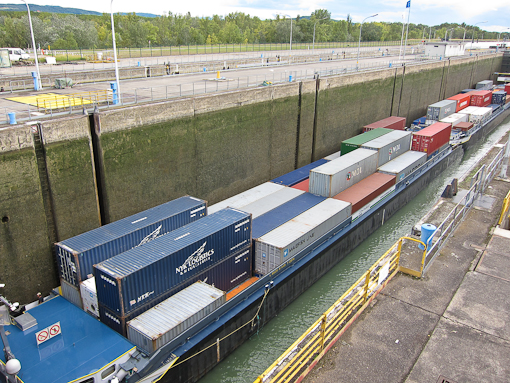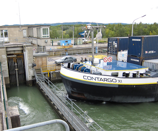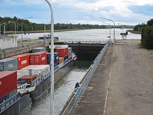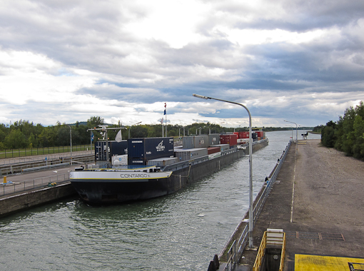 On the map, we saw a little island where the road winds its way across the river.  But we did not expect a lock (for those interested in how a lock works, see wikipedia entry), let alone an elevated viewing platform.  So we parked and watched one half of a cycle of its operation which took about 15 minutes – starting with two container carriers traveling downstream from Basel towards Strasbourg.