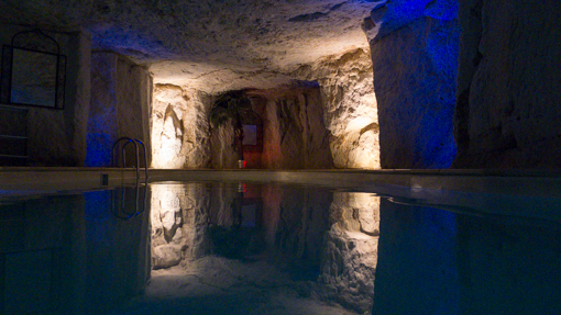 We had the pool to ourselves … bathing in the colored lights reflecting off the white cave walls.