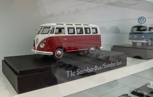 Volkswagen started producing Sambas in 1951. In the sixties this version became popular as a hippie bus. Instead of a sliding door at the side the Samba had two pivot doors. In addition the Samba had a fabric sunroof. At that time Volkswagen advertised with the idea of using the Samba to make tourist trips through the Alps. Sambas were standard painted in two colors. Usually, the upper part was colored white. The two colored sections were separated by a decorative strip. Further the bus had a so-called “hat”: at the front of the van the roof was just a little longer than the car itself to block the sun for the driver.