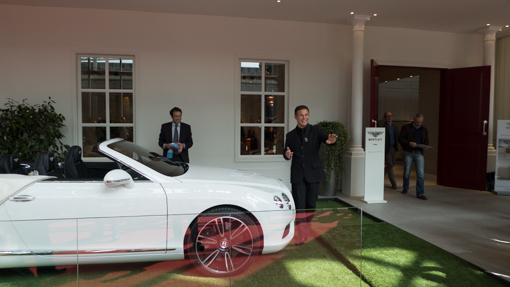 Bentley managed to attract a crowd outside its door with a convertible, and they were doing the doorman thing too … look at him dancing …