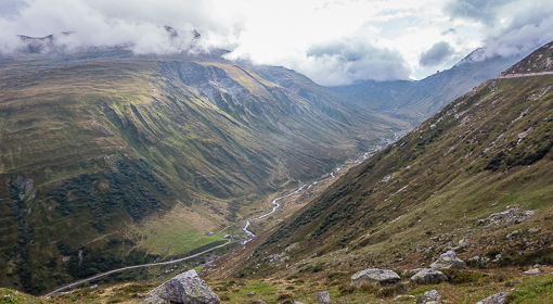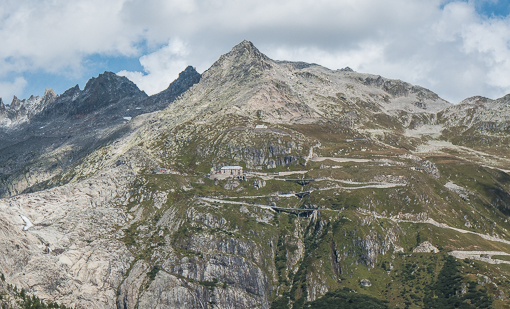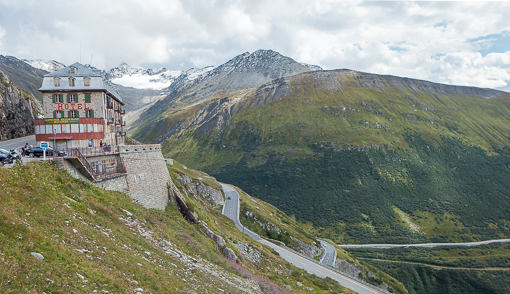To get to Andermatt where we spent the first night of the road trip, we had to traverse another mountain pass – the Furkapass. We retraced our drive from Grimselpass back down to Gletsch (1759 m), cross the Rhône in town, and then zigzag up the mountain on the other side towards Hotel Belvédère.