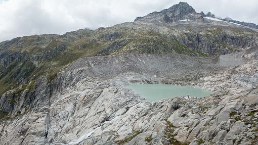 Water from the glacier collects in a small lake which feeds a stream that runs downhill to Gletsch and beyond as river Rhône.