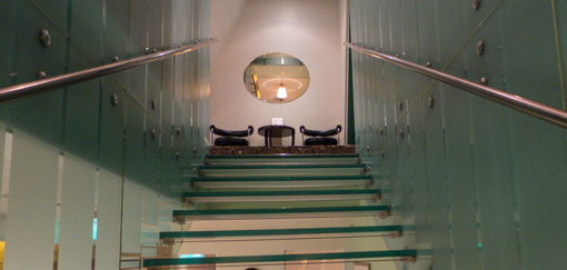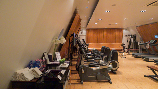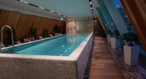 The indoor lap pool and gym are located on the “attic” floor under a sloping roof, accessible via a set of glass stairs (à la Apple store).