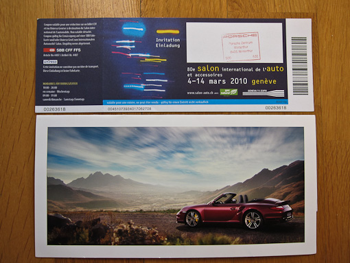 We went to see the annual 80th International Motor Show (80e Salon International de l’Auto) at Geneva’s Palexpo on the second but last day in March 2010.  We were stuck in traffic outside Geneva for almost an hour – all because of the show.  We detoured into town, parked at the rail station, and took the train to Palexpo.  I was given two tickets (courtesy of a Porsche dealership) so entrance was free.