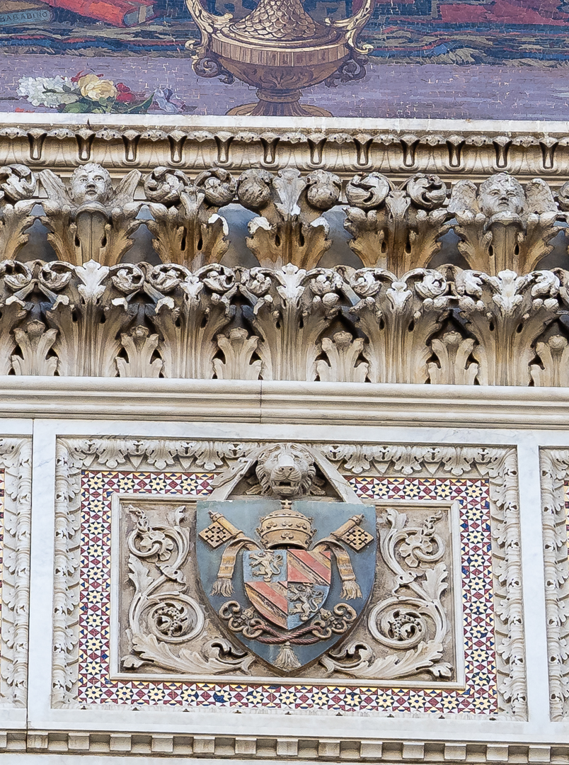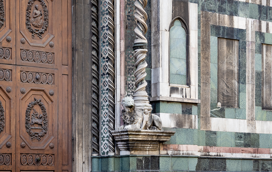 Like the cathedral, it is clad with green, pink and white Tuscan marble.