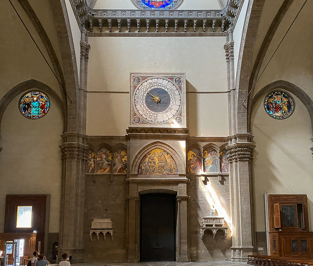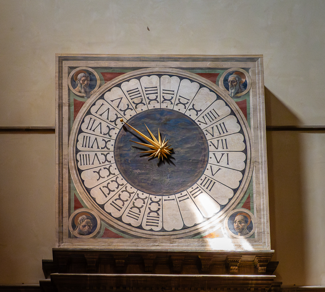 According to Wikipedia, “… Above the main door is a colossal clock face with fresco portraits of four Prophets by Paolo Uccello (1443). This one-handed liturgical clock shows the 24 hours of the hora italica (Italian time), a period of time ending with sunset at 24 hours. This timetable was used until the 18th century. This is one of the few clocks from that time that still exist and are in working order.”