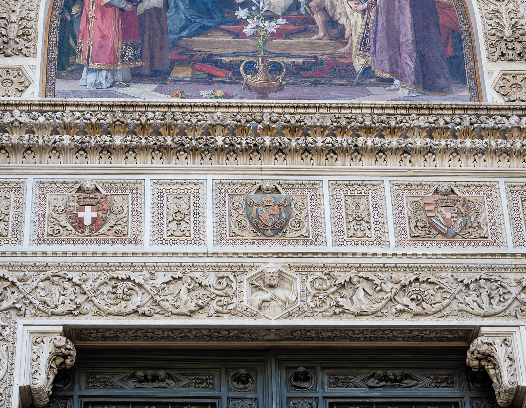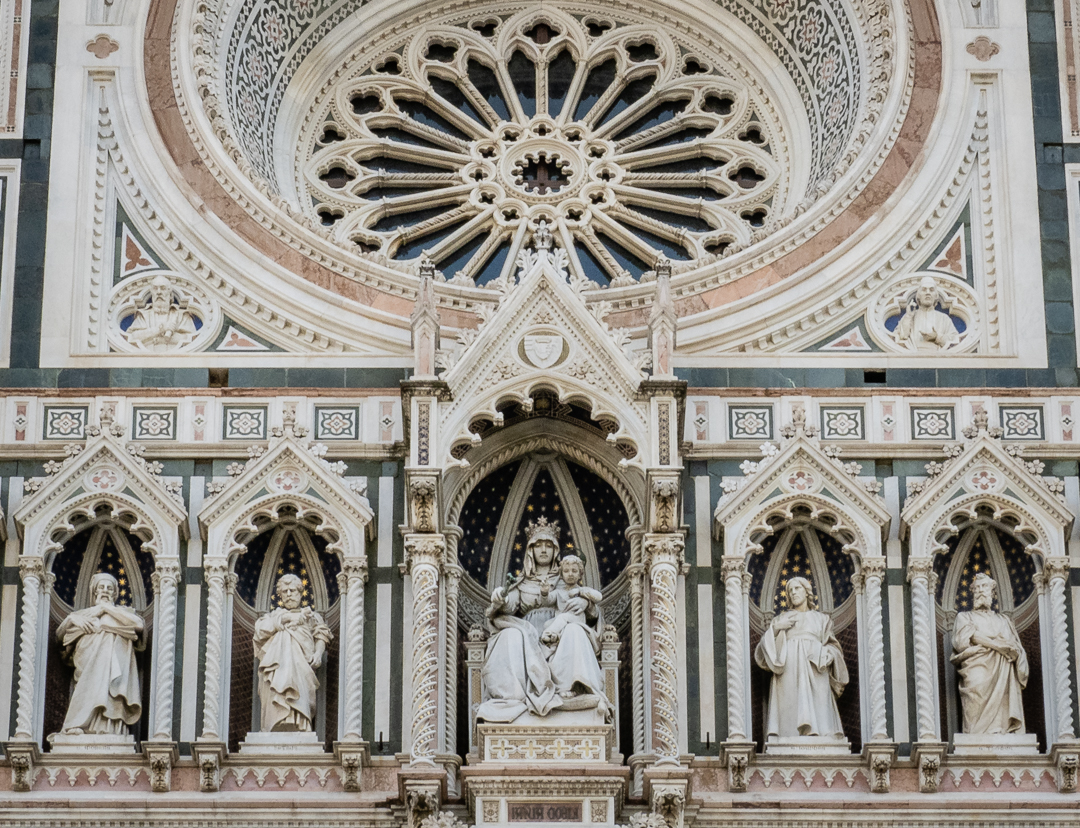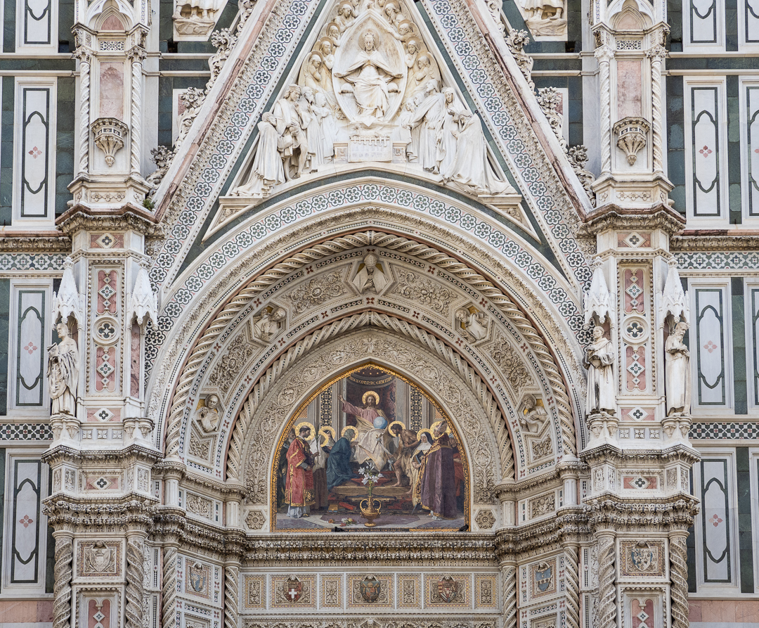 The exterior that we see is not the original. In 1864, a competition was held to design a new façade, it was won by Emilio De Fabris in 1871. Work on the neo-Gothic façade in white, green and red marble began in 1876 and was completed in 1887.