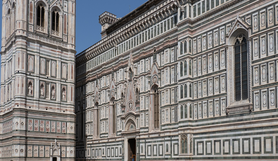 The Campanile (bell tower) of the cathedral was originally designed in 1334 by Giotto di Bondone and completed in 1359.
