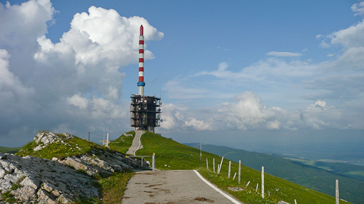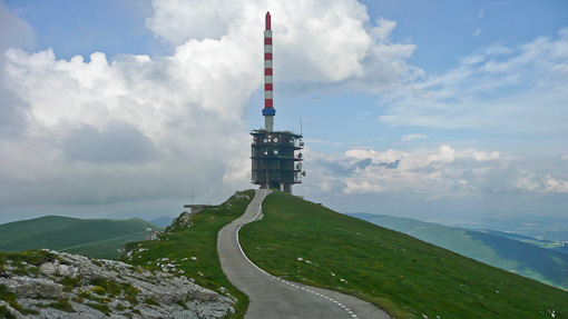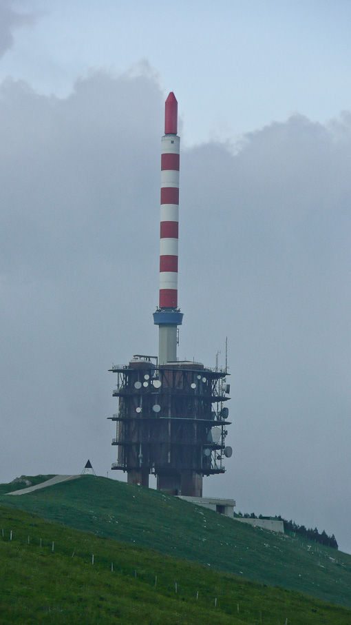 We approached La Chassarel by car from the north.  You can just see the tower as a little stick near the top of the ridge.  It is 120 meters tall and was built in 1983.