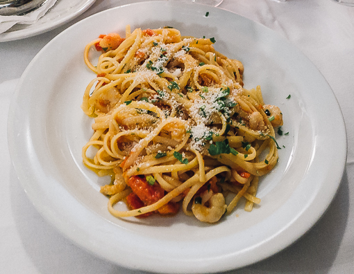 Sue ordered pasta with shrimps and tomatoes, and enjoyed it enormously. She even complained that there wasn’t enough.