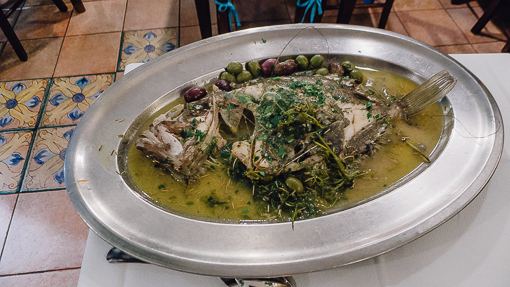 According to a 1845 cookbook, the fish should be baked and our waiter had a reaction when we first suggested grilling it. Our dish was baked with fresh olives, olive oil and some herbs.
