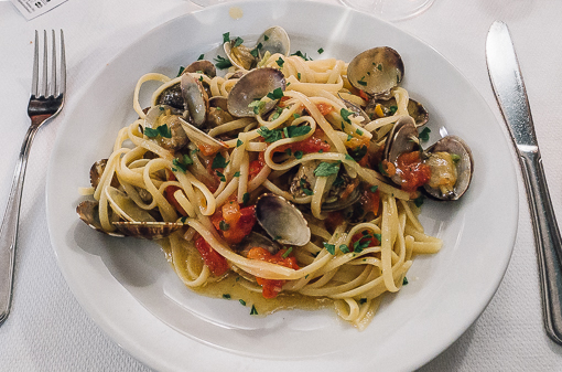 For the pasta course, we all had something different. I (Chris) ordered the Vongole, my standard favorite, despite the presence of clams in the starter. Excellent.