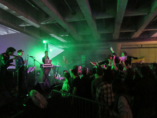 The first live act came on just after midnight and it was “The National Fanfare of Kadebostany” – not bad but a bit underwhelming for me – but evidently very exciting for some at the front. Their music was a mix of electronic beats with clarinet/saxophone, trombone, and electric guitar.