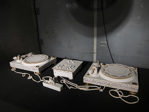 The vast space included several train carriages that served as makeshift spaces for displaying art (e.g., ceramic turntable and mixer) and VIP seating areas.