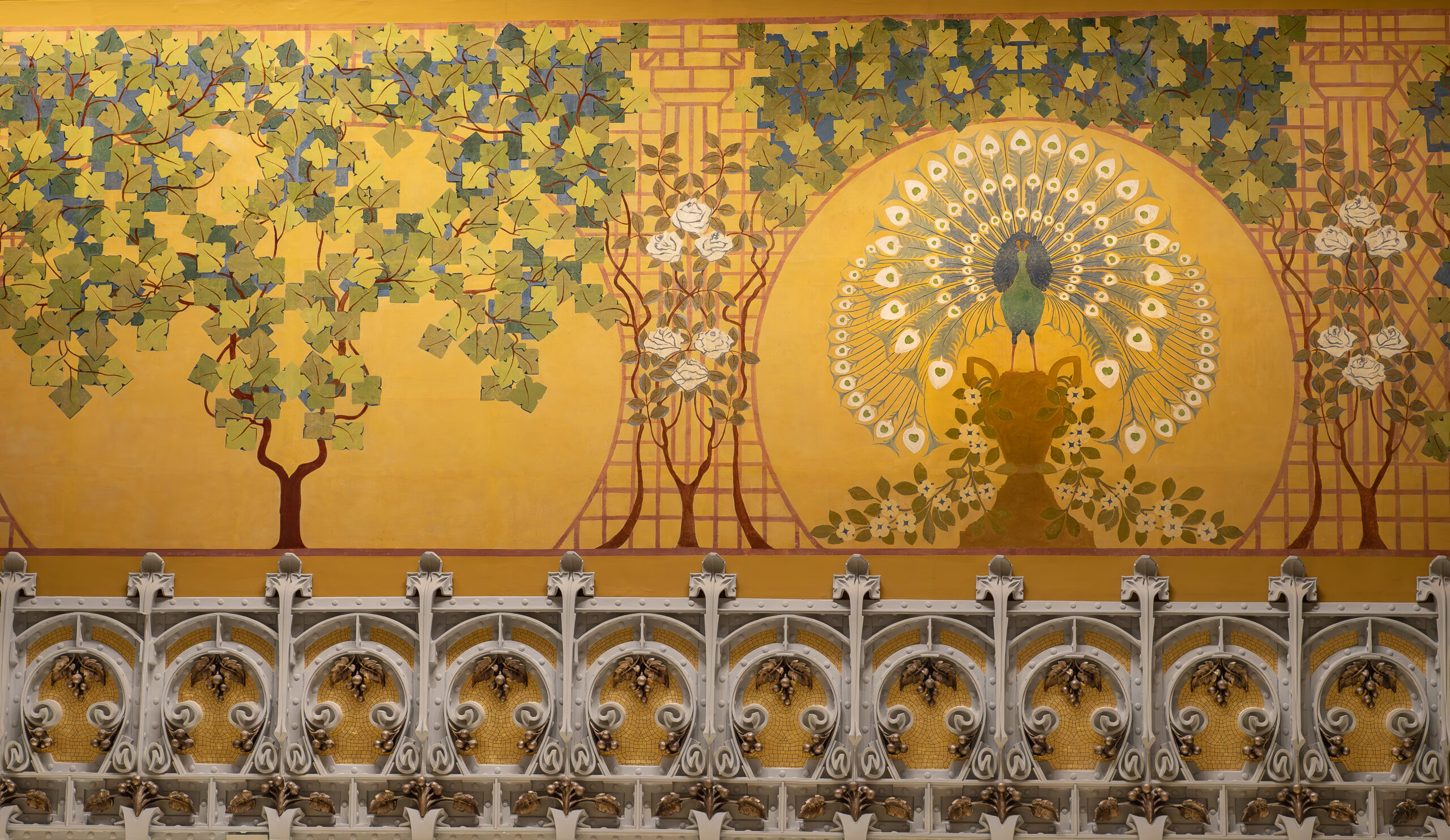 The frescos depict peacocks with their tails spread out in full display, surrounded by elaborate floral and foliage patterns. They are quintessential examples of Art Nouveau, with the peacock motif often associated with beauty and elegance.