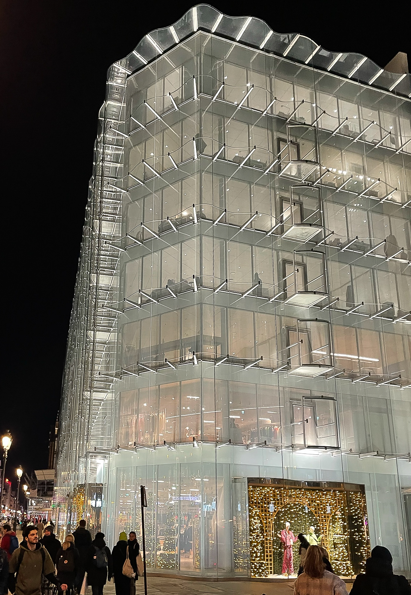 We walked past a sales point for Ruinart champagne. It was notable that the color of the drink and its reflection matched the Christmas lights in the store – this is retail design at its best.
