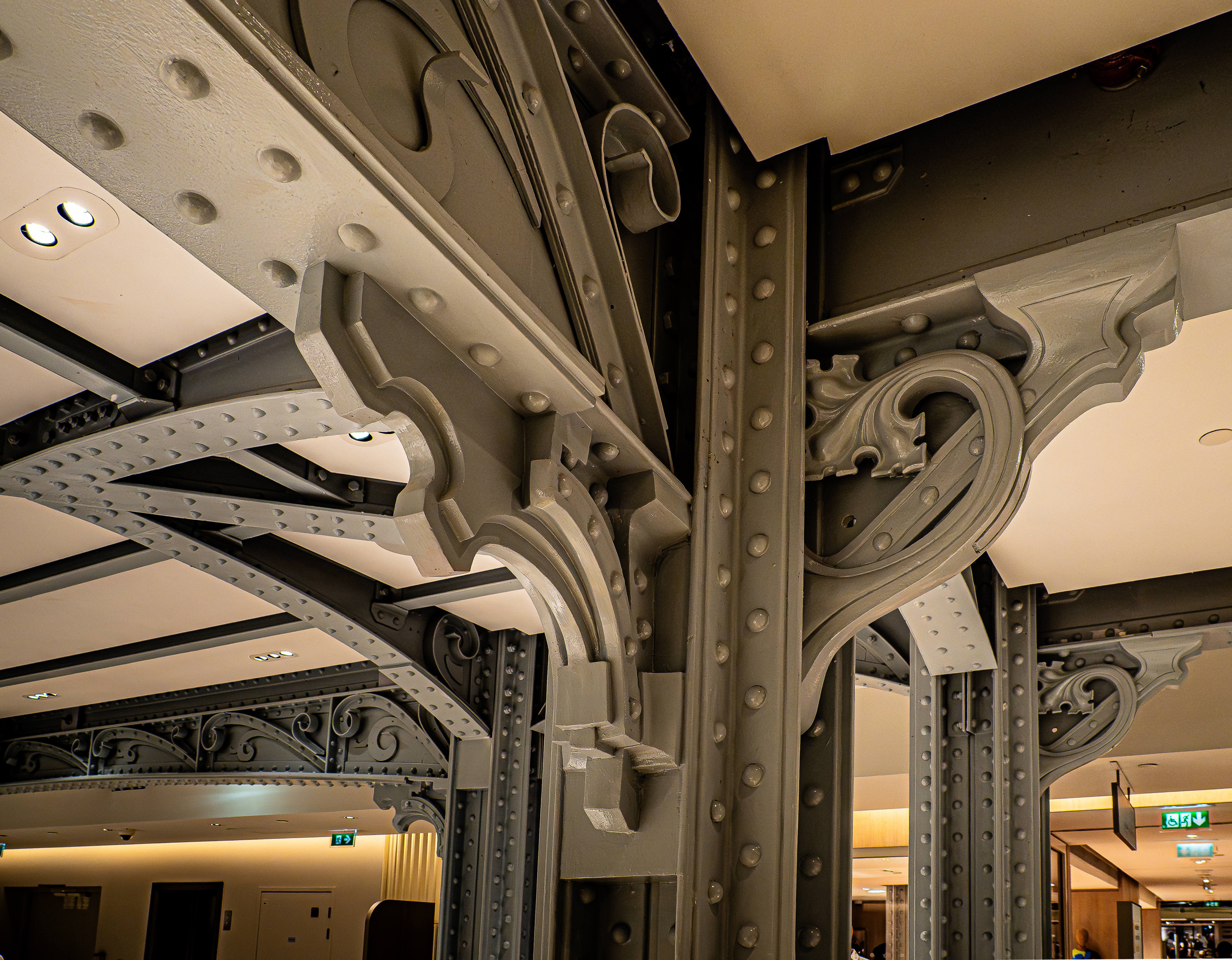 The metal work is amazing and fantastic, combining riveted steel beams and floral elements. The aesthetic is consistently applied to the exposed structural elements throughout the building.