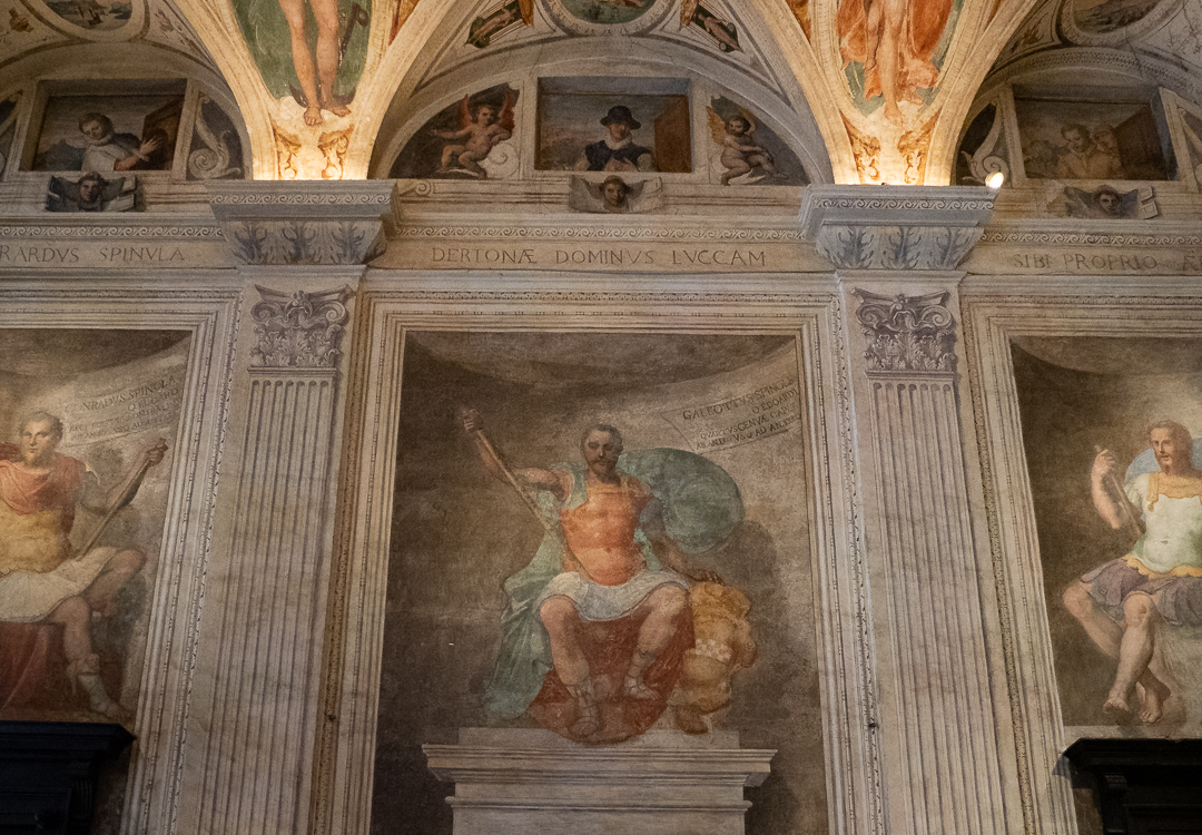 The facade of the palace is decorated with frescoes executed by the Calvi brothers. The frescoes tell the stories of the House of Spinola (red and white checkerboard coats of arm) and depict members dressed as Roman condottieri.