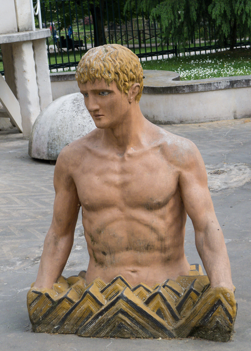There were a podium, a lighthouse and several items in the pond – indeed a very strange or surreal set – a “swan” and two guys (from torso up only), both situated inside something that can only be described as a ring of yellow triangular wavelets – one guy waving or pointing at something and the other blonde one staring (with a frown) at the first guy. There must be some subtext here.