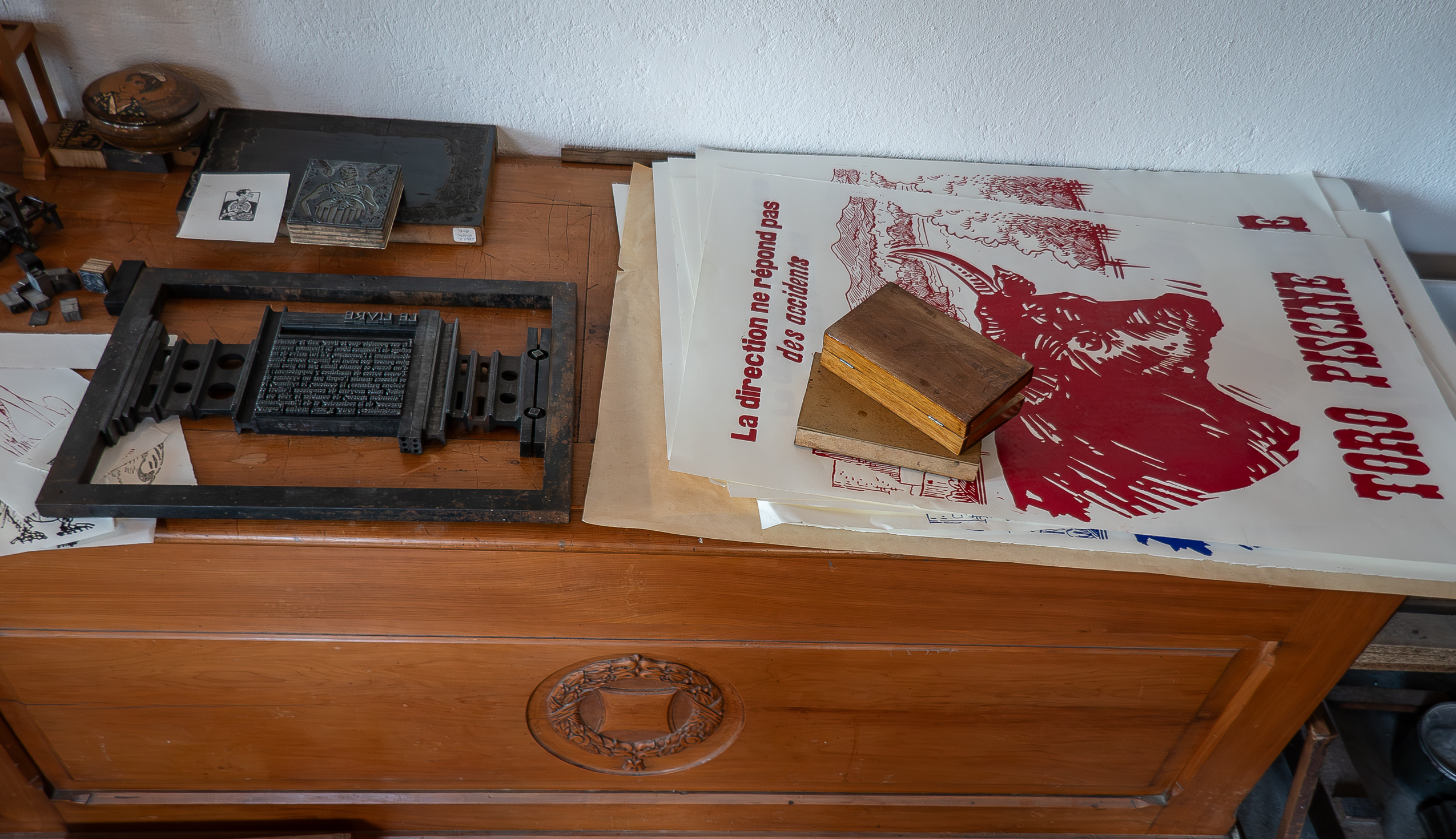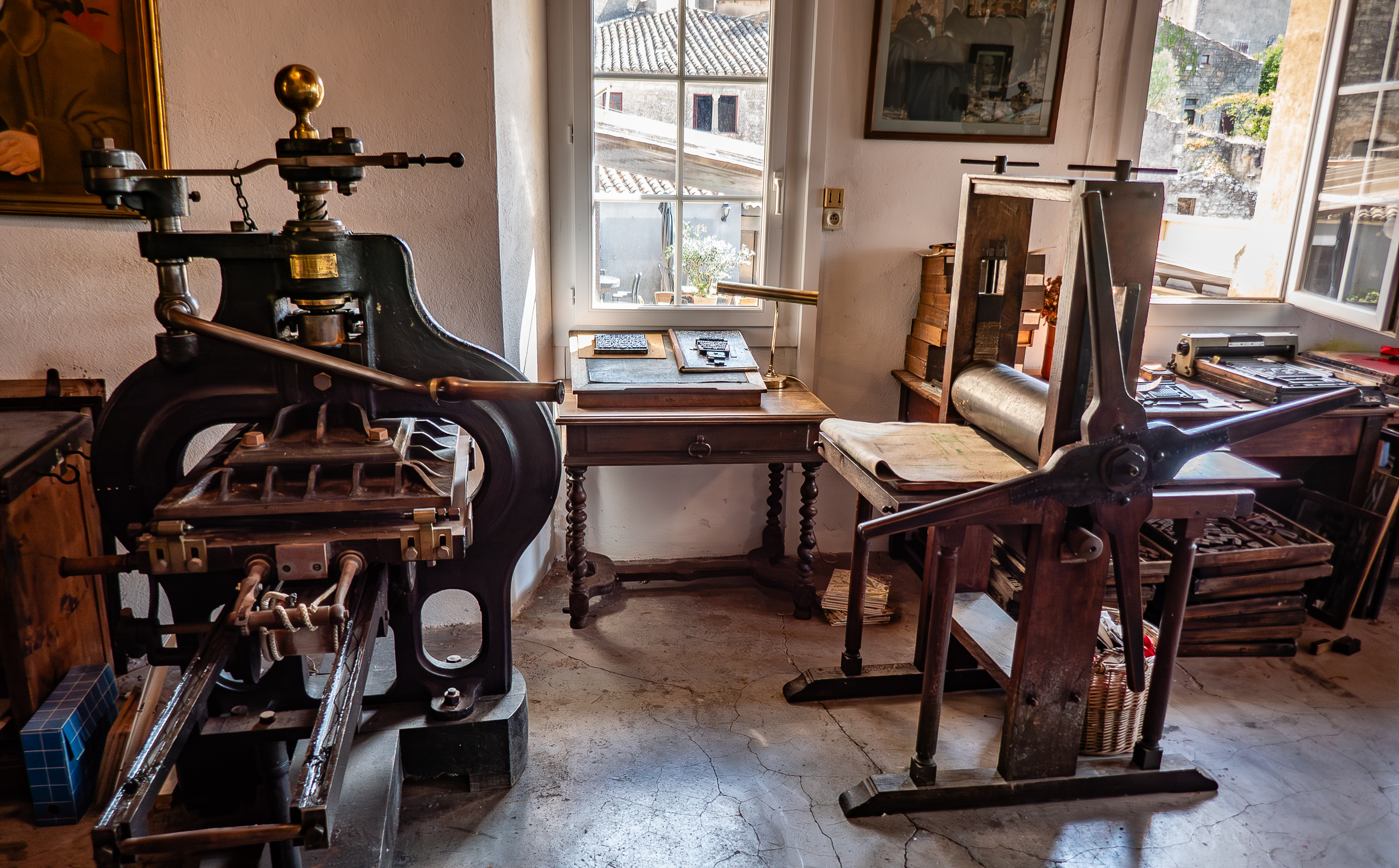 Opposite the museum is L’Atelier Louis Jou—his working print shop—equipped with three Stanhope heavy iron hand presses, cases of his type, and engraving tools. The foundation uses the shop for demonstrations and education.