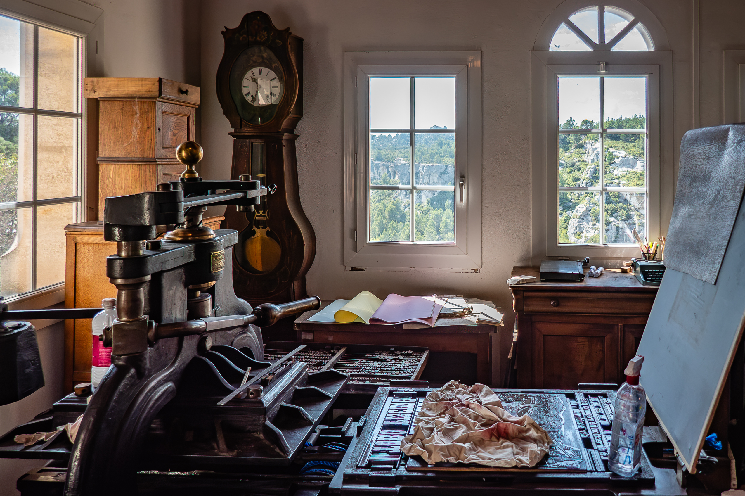 While we were on a walking tour of Les Baux-de-Provence in the Alpilles mountain, northeast of Arles, we came across a printing house (imprimerie, gravure means engraving). A closer look revealed that this is a studio and museum created by the Fondation Louis Jou.